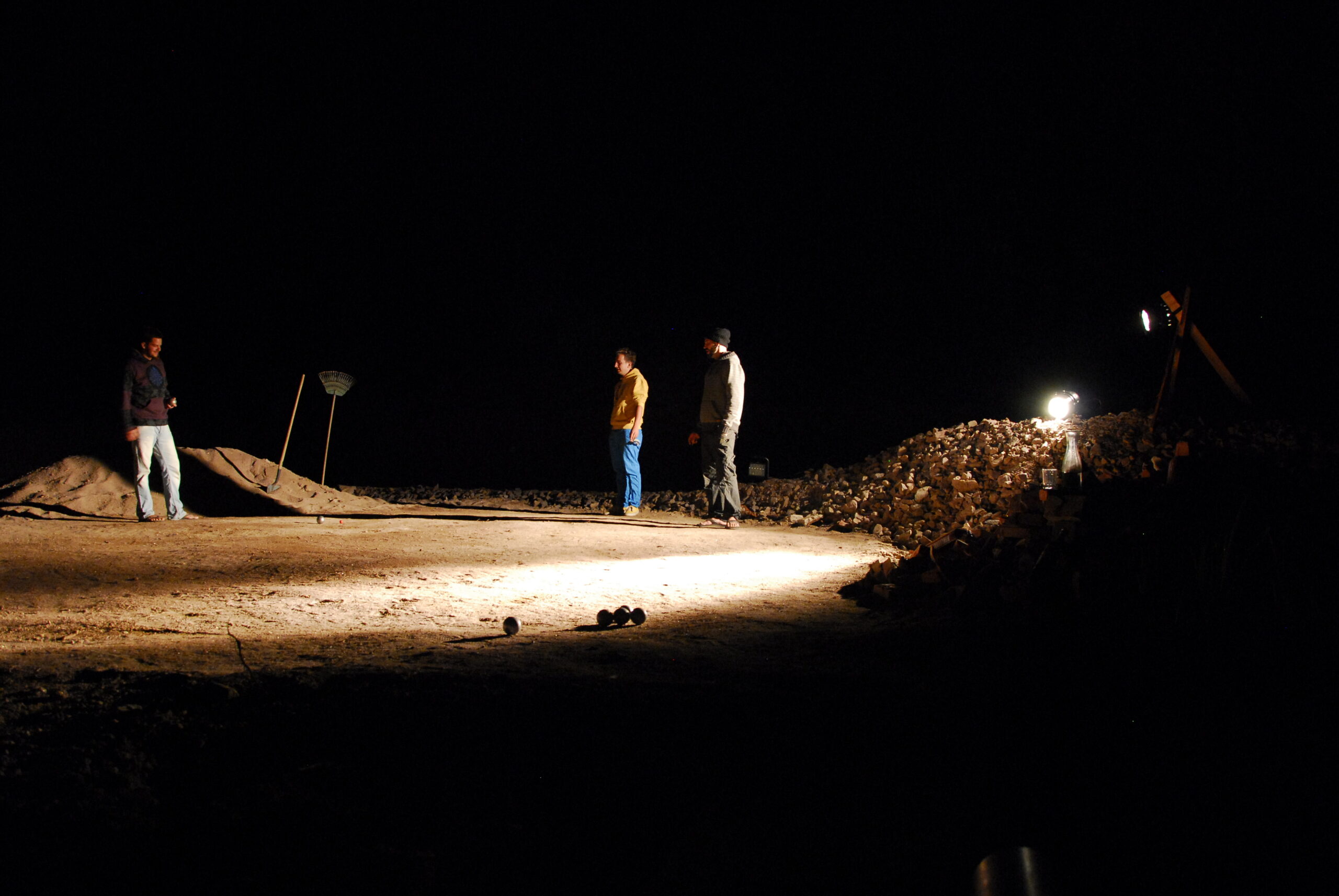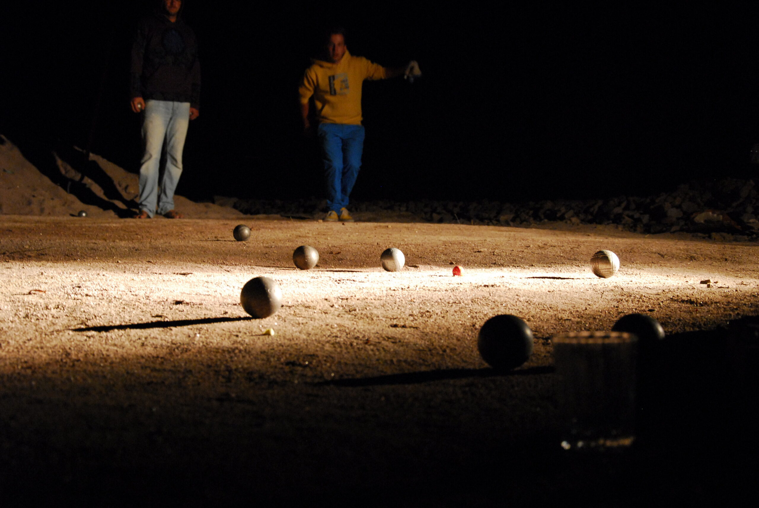 Es muss ja nicht immer edler Schloss-Kies sein : ) Spass macht Pétanque überall und (wie unsere Fotos beweisen) auch mitten in der Nacht. Die Regeln sind vergleichsweise einfach und es sind weder besondere Kraft noch ein bestimmtes Spielfeld nötig. Im Unterschied zu anderen Boule-Spielen (und auch Boccia) wird Pétanque von einem Abwurfkreis heraus statt von einer Linie gespielt. Beide Füsse müssen beim Werfen solange im Abwurfkreis Bodenkontakt halten, bis die geworfene Kugel wieder den Boden berührt.Ziel des Spiels ist es, seine Kugeln näher an einer kleineren Zielkugel (frz. „cochonnet“ d.h. „Schweinchen“) zu platzieren als der Gegner.